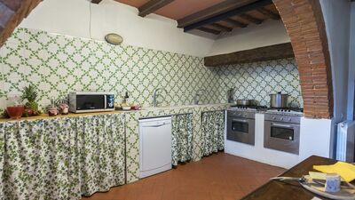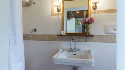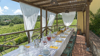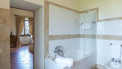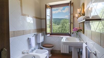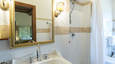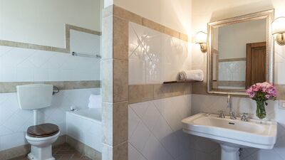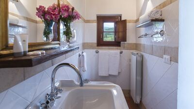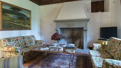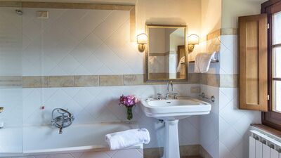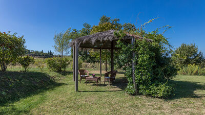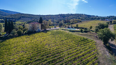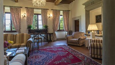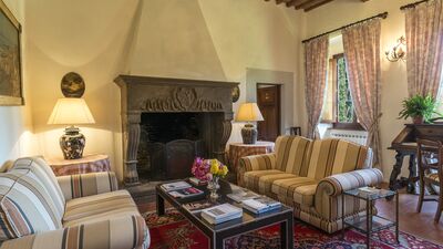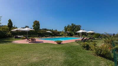 Environ un hectare de parc entoure le Palazzaccio, caractérisé par de grands espaces plantés de gazon, bordés sur les côtés par les vignobles de la propriété qui se perdent dans l'horizon vallonné. Depuis le portail d'entrée, par une élégante avenue privée bordée de cyprès, vous atteignez le parking juste à côté de la villa. Dans le magnifique jardin, entretenu et animé par de multiples fleurs, des espaces de loisirs ont été aménagés pour la détente en plein air, idéaux pour les situations de socialisation mais aussi, dans le cas de grands groupes de personnes, pour garantir des moments privés ou une détente tranquille. Le porche devant la villa principale, avec accès direct depuis la cuisine, et la pergola équipée d'une table et de sièges, située entre la villa et l'annexe, sont les deux endroits idéaux pour les repas en plein air. N.B. : Veuillez noter que les séances photos ont généralement lieu au printemps. Les couleurs et les fleurs des jardins, des pelouses et des parcs peuvent donc être différentes lorsque vous entrez dans la villa.
