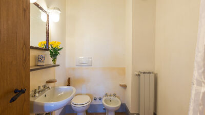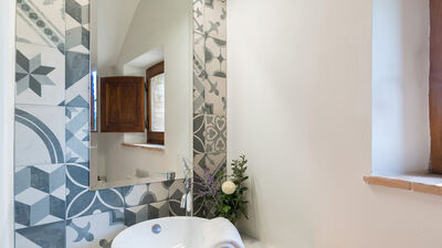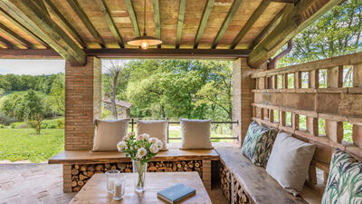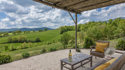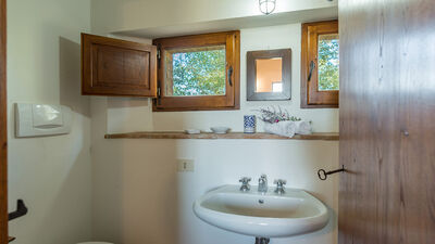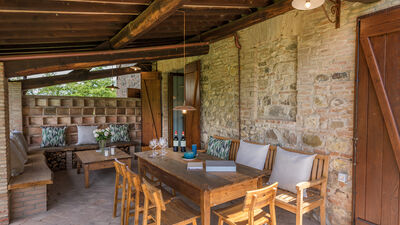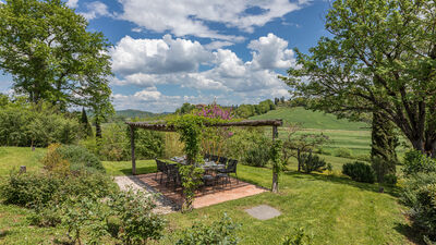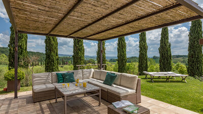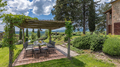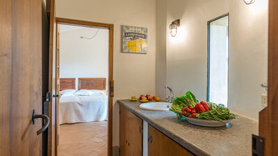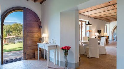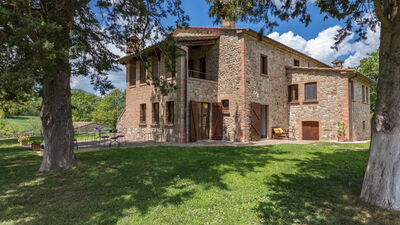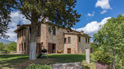 Le magnifique domaine où se trouve la ferme couvre une superficie d'environ 5 hectares, en partie recouverte de terres cultivées et en partie de maquis forestiers. Le jardin d'environ 2000 mètres carrés regorge de nombreux types de fleurs qui alternent dans les pelouses bien entretenues autour de la maison et dans la piscine. Une rangée de cyprès majestueux borde l'allée menant à la ferme et autour de la piscine. En sortant de la cuisine, sur une terrasse inférieure, nous trouvons une grande pergola pavée avec un coin repas meublé avec table et chaises. À côté de l'entrée principale, vous trouverez un grand porche meublé où vous pourrez trouver de l'ombre pendant les journées les plus chaudes. À côté de l'annexe se trouve un magnifique belvédère meublé et enfin, en suivant un chemin pavé, vous atteignez une pergola romantique ombragée et panoramique. Le parking, qui compte 5 places de stationnement, est situé à un niveau inférieur à celui de la villa principale. N.B. : Veuillez noter que les séances photos ont généralement lieu au printemps. Les couleurs et les fleurs des jardins, des pelouses et des parcs peuvent donc être différentes lorsque vous entrez dans la villa.