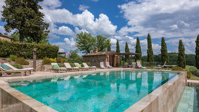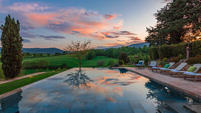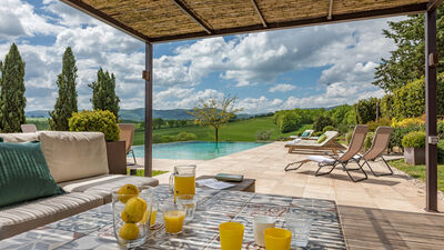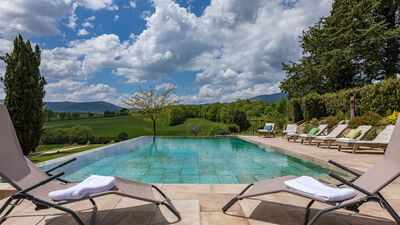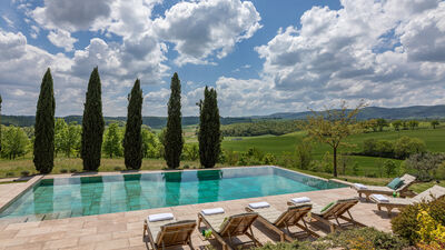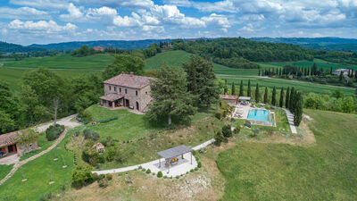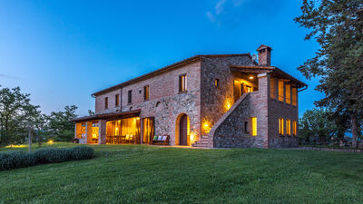 Entre les collines sur lesquelles se trouvent San Casciano dei Bagni et Chiusi, l'un des villages les plus beaux et les plus fascinants de Toscane, au pied du Monte Cetona, se trouve le magnifique Podere Fabbrica. La ferme en pierre, qui semble entourée par les majestueux cyprès qui l'entourent, est située à la frontière entre la Toscane et l'Ombrie. Encadré par ce contexte fascinant, il vous accueillera dans ses murs, mettant en valeur les matériaux précieux qui habillent à la fois les chambres et les espaces extérieurs. Ils vont de la célèbre terre cuite strictement artisanale aux poutres en châtaignier qui soutiennent les sols. Le Podere Fabbrica se compose de la villa principale et d'une annexe. La structure est idéale pour les réunions de famille, les groupes d'amis, les familles avec enfants qui souhaitent passer leurs vacances ensemble tout en préservant leur intimité. Le jardin possède de nombreuses plantes, de grands arbres et des fleurs typiques de la région et à quelques mètres de la maison, sur une terrasse inférieure, se trouve la belle piscine panoramique à débordement. Prendre un apéritif sous le belvédère au bord de la piscine ou dîner sous la pergola sera une expérience inoubliable, surtout au coucher du soleil avec vue sur les collines et les villages environnants. La ferme est le résultat de la restauration d'une ancienne maison paysanne datant de 1800 et a été mise en lumière grâce aux rénovations qui ont donné vie à un lieu unique. Pour plus de confort, les chambres spacieuses sont toutes équipées de la climatisation. Bref, une belle maison pour ceux qui recherchent l'intimité, la détente et la tranquillité. À une courte distance de l'Autostrada del Sole (avec la sortie Fabro à environ 12 km), la ferme est située dans une position géographique privilégiée qui, bien que privée, vous permet de vous déplacer facilement pour visiter les belles villes du Val di Chiana telles que Montepulciano, Cetona ou Chianciano Terme, les villages du Val d'Orcia voisin, tels que Montalcino, Pienza, San Quirico, Castiglione ou Bagno Vignoni et ceux de la région de l'Ombrie.