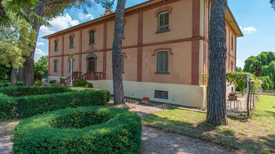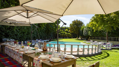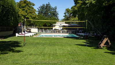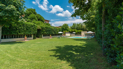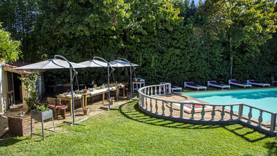 La piscine est ouverte du dernier samedi d'avril au premier samedi d'octobre, elle se trouve à seulement quelques mètres de la maison, dans une position légèrement plus basse et est facilement accessible depuis le jardin par une légère pente. L'intimité est garantie par une haie de lauriers qui sépare le solarium du reste du parc. La piscine rectangulaire possède un escalier romain pour accéder à l'eau et une douche froide. Il mesure 11 m x 7 m avec une profondeur constante de 1,25 m. La baignoire est recouverte intérieurement de PVC, le bord extérieur et la zone du solarium sont en terre cuite. Il est équipé de chaises longues et de parasols et entouré de plantes centenaires qui fournissent naturellement quelques zones d'ombre. Près de la piscine se trouve une grande véranda ouverte qui abrite une cuisine entièrement équipée et une grande table avec des chaises, idéale pour d'agréables repas en plein air.